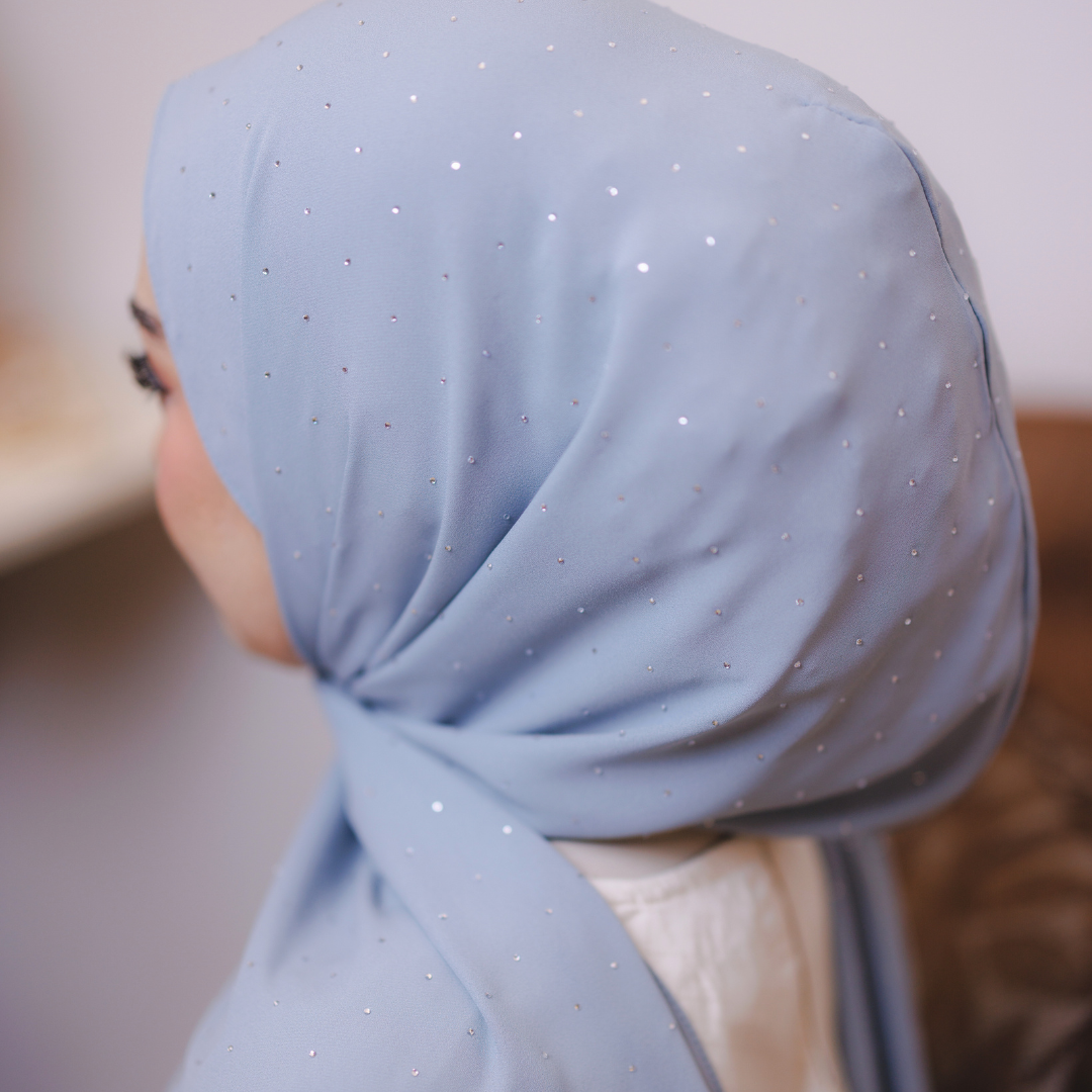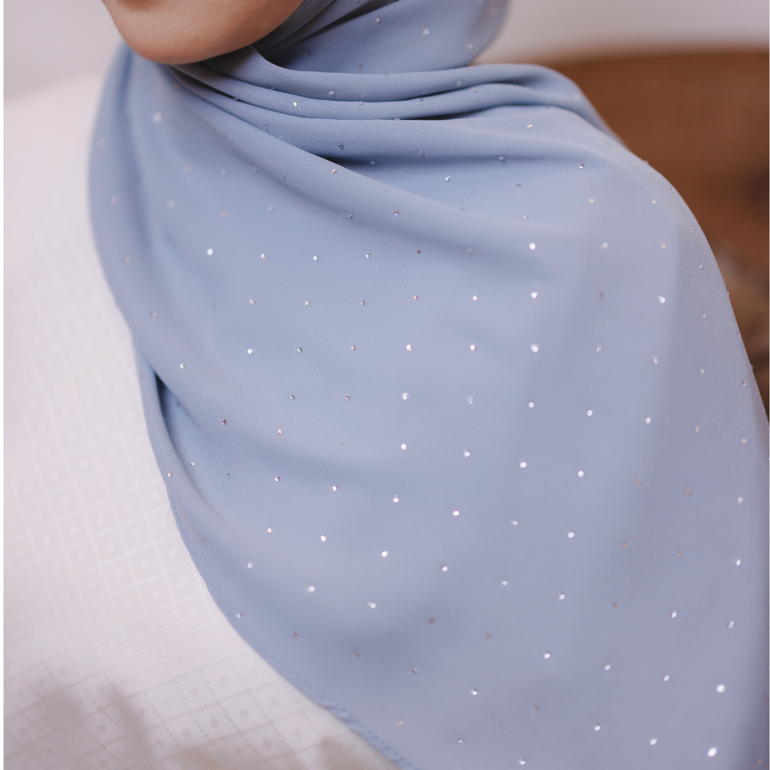 Dihiasi taburan diamond halus yang berkilau cantik di seluruh permukaan shawl. Kilauan lembutnya memberi efek mewah dan classy — sesuai untuk majlis, raya atau elevasi gaya harian.
