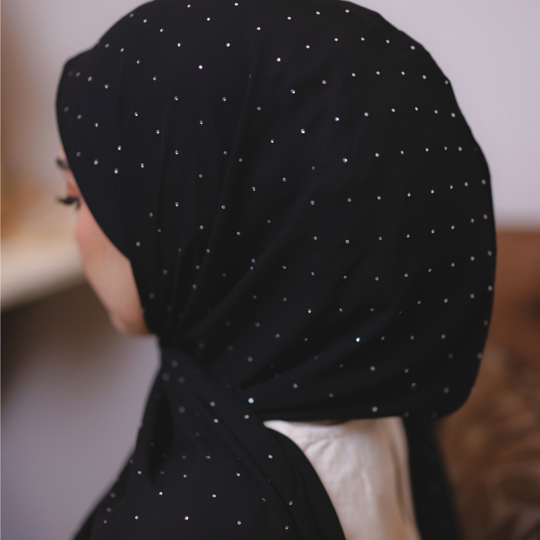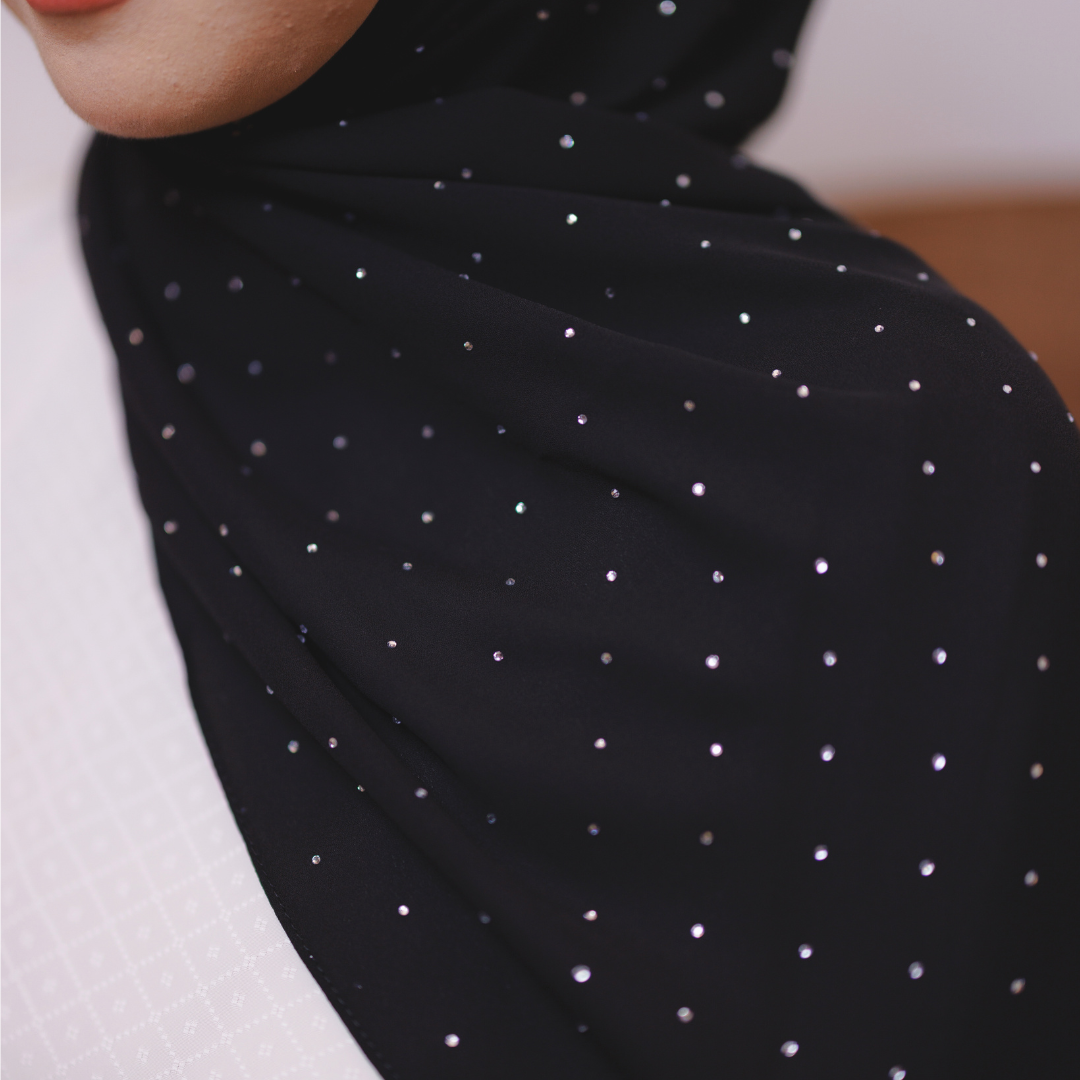 Dihiasi taburan diamond halus yang berkilau cantik di seluruh permukaan shawl. Kilauan lembutnya memberi efek mewah dan classy — sesuai untuk majlis, raya atau elevasi gaya harian.