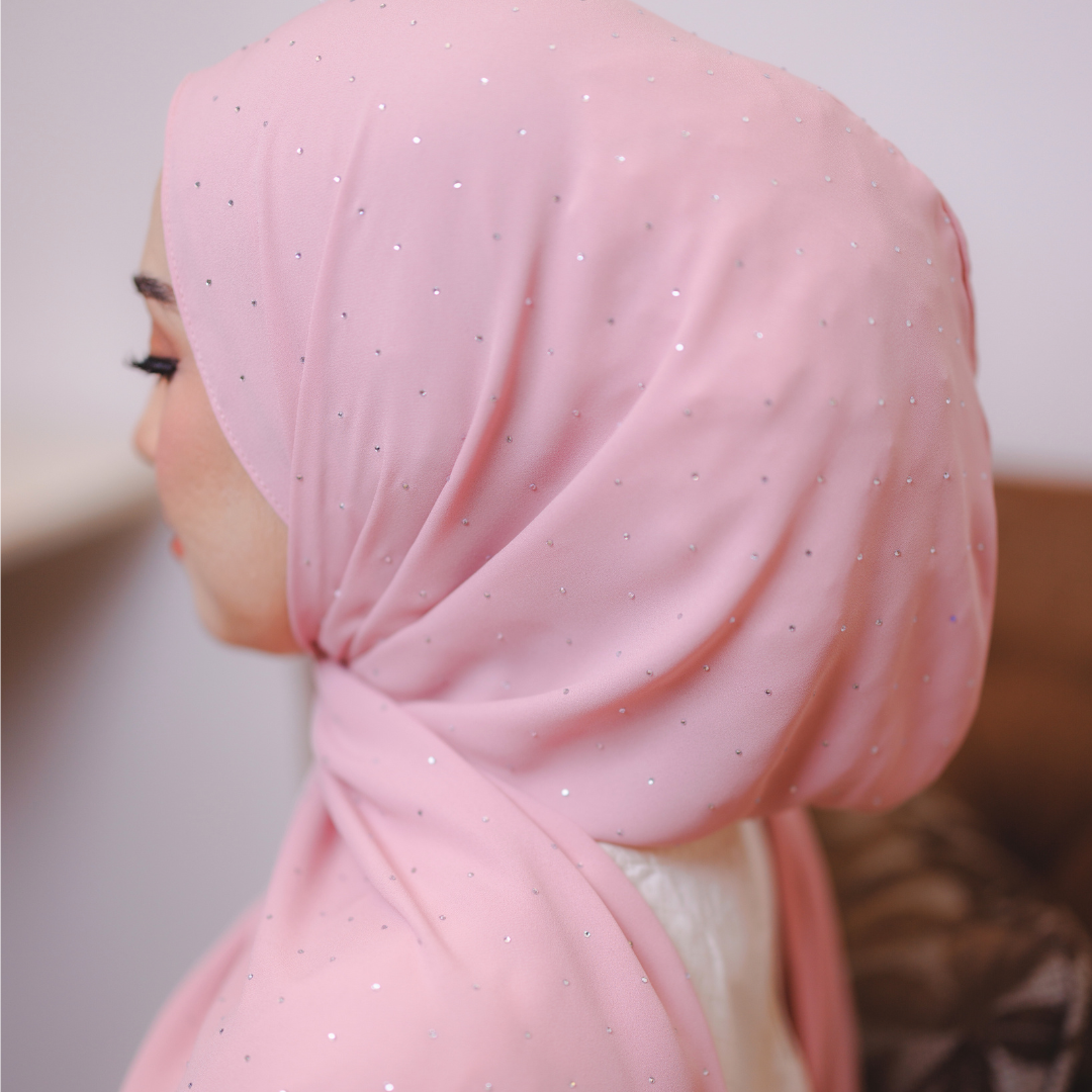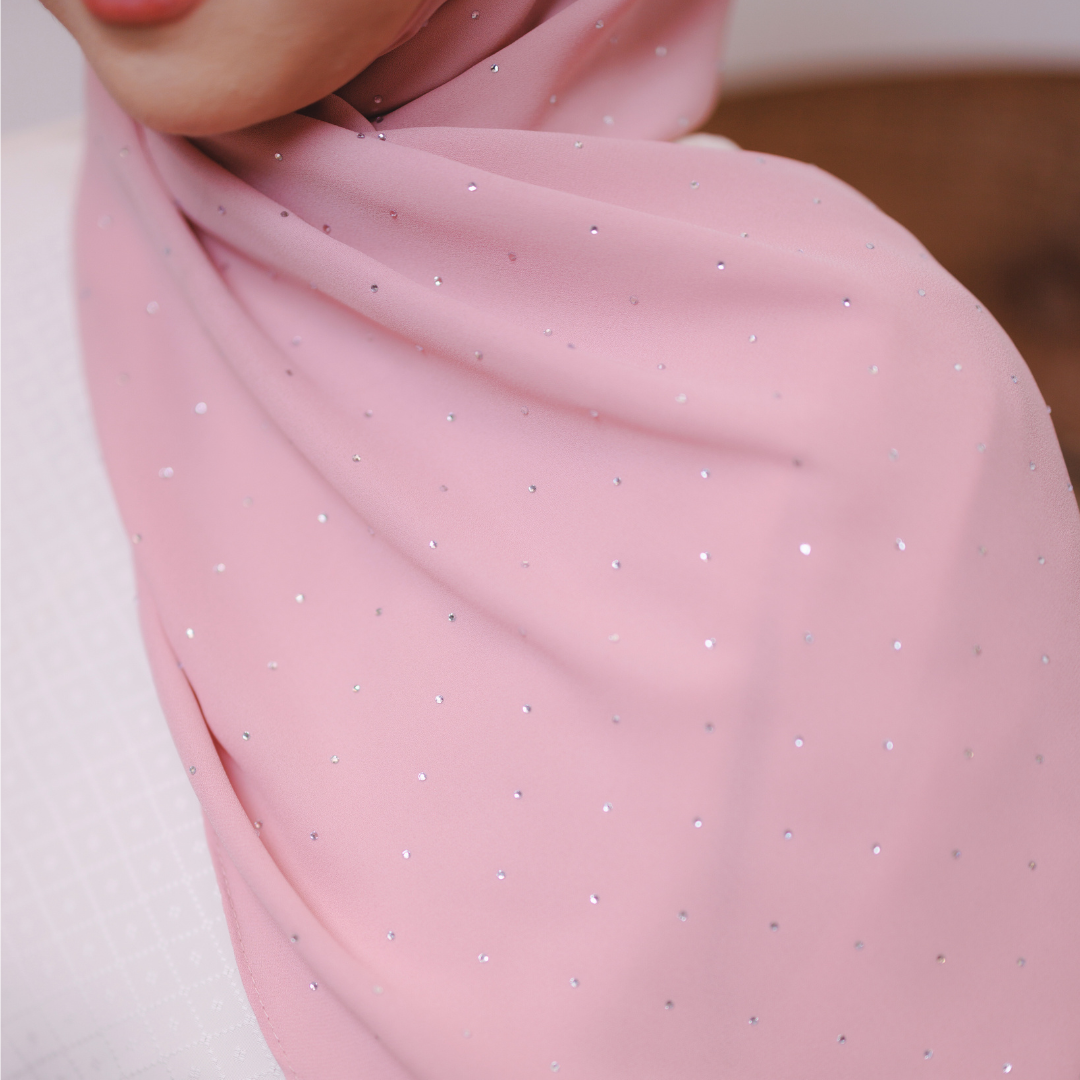 Dihiasi taburan diamond halus yang berkilau cantik di seluruh permukaan shawl. Kilauan lembutnya memberi efek mewah dan classy — sesuai untuk majlis, raya atau elevasi gaya harian.