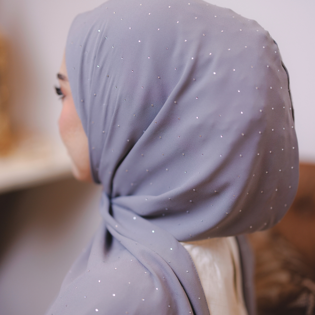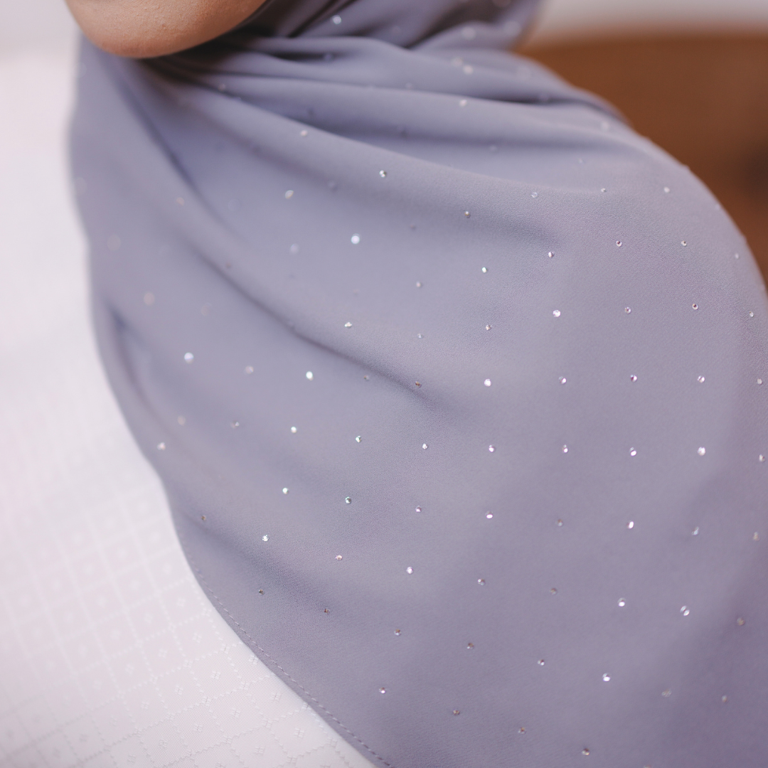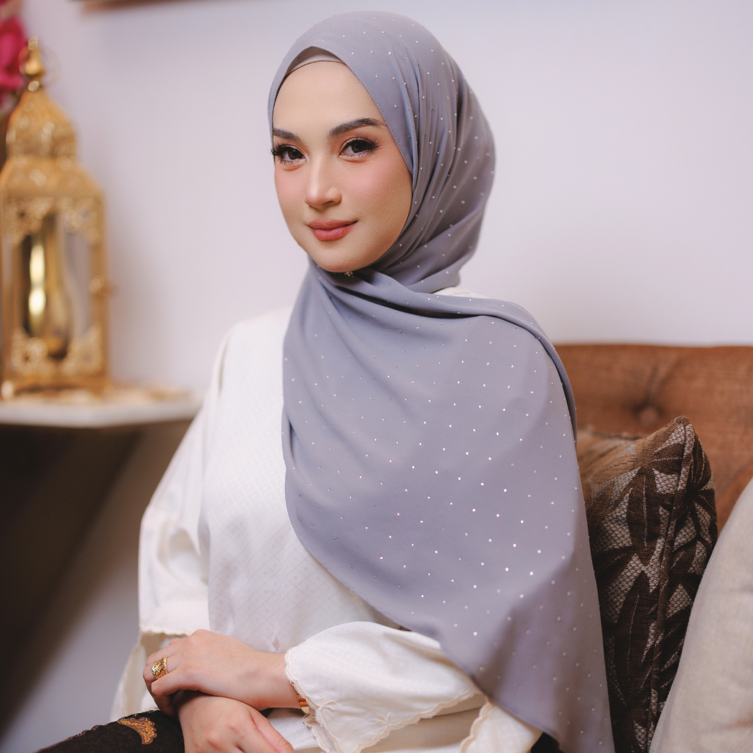 Dihiasi taburan diamond halus yang berkilau cantik di seluruh permukaan shawl. Kilauan lembutnya memberi efek mewah dan classy — sesuai untuk majlis, raya atau elevasi gaya harian.