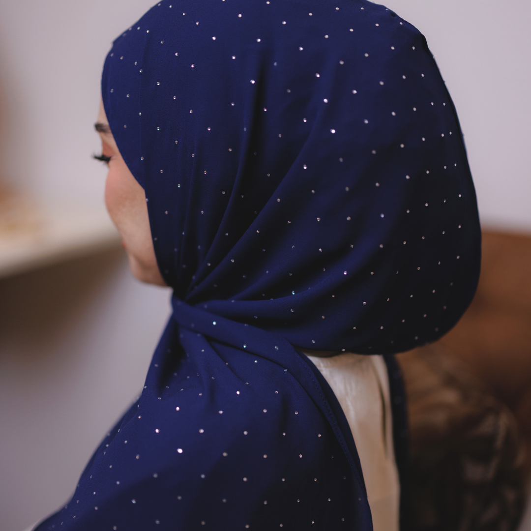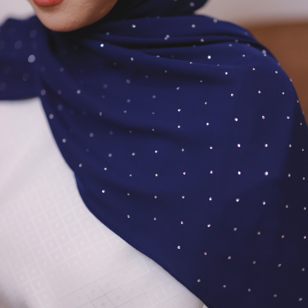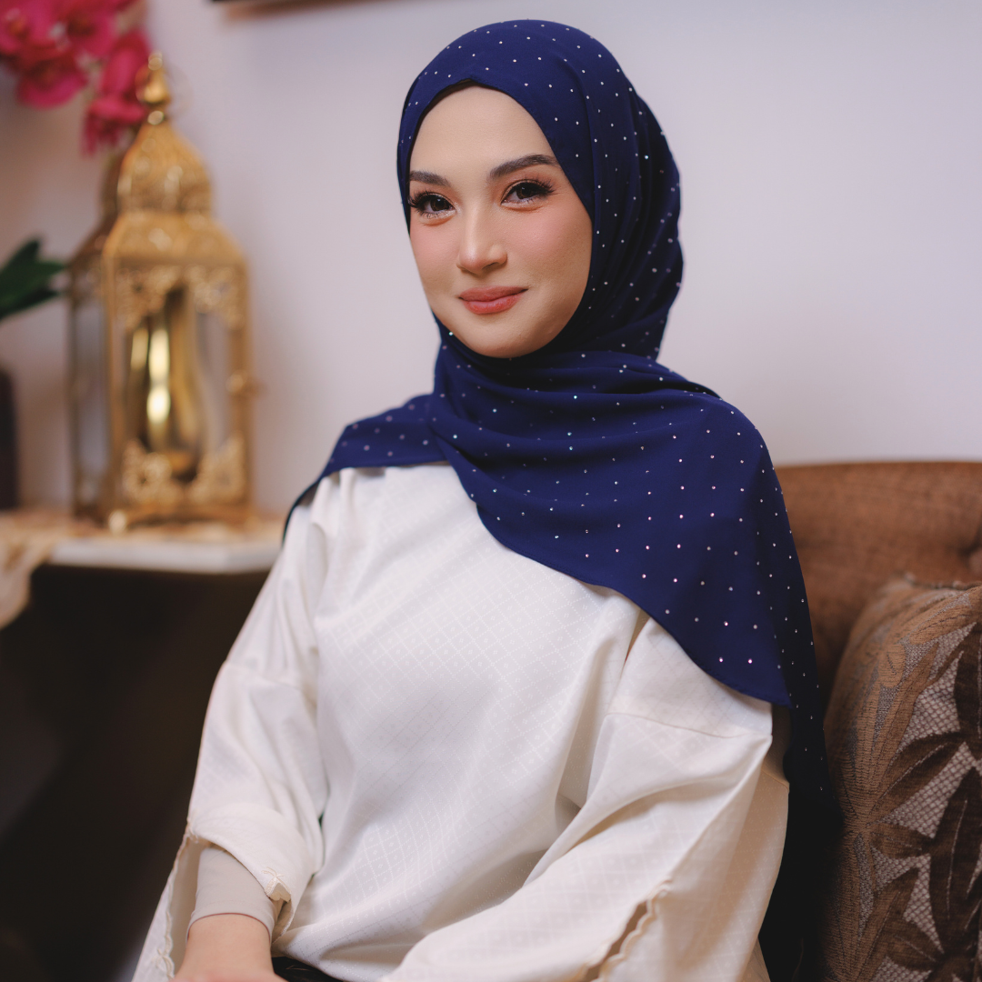 Dihiasi taburan diamond halus yang berkilau cantik di seluruh permukaan shawl. Kilauan lembutnya memberi efek mewah dan classy — sesuai untuk majlis, raya atau elevasi gaya harian.
