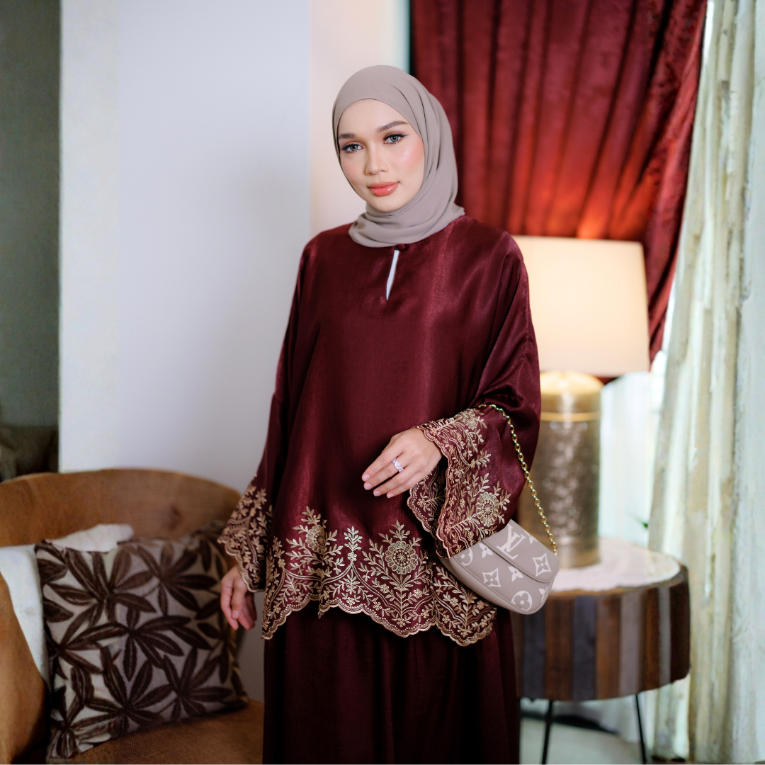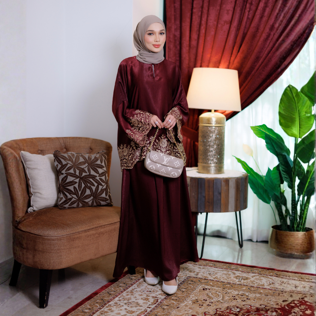 Bahagian lengan dan bawah baju dihiasi sulaman eksklusif bercorak floral yang menaikkan seri pemakai. Cutting baju yang longgar memberi efek ramping, sopan, dan terletak cantik untuk semua bentuk badan.