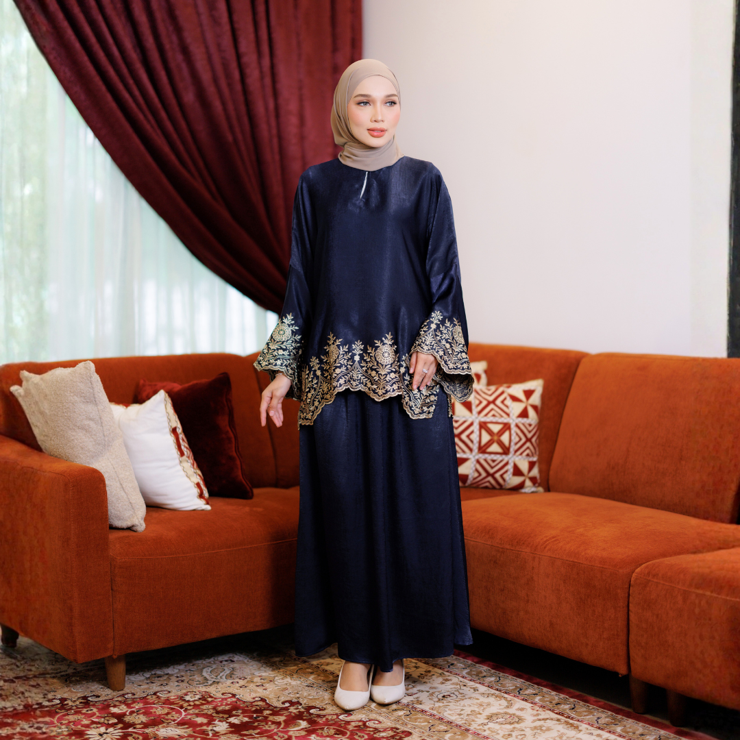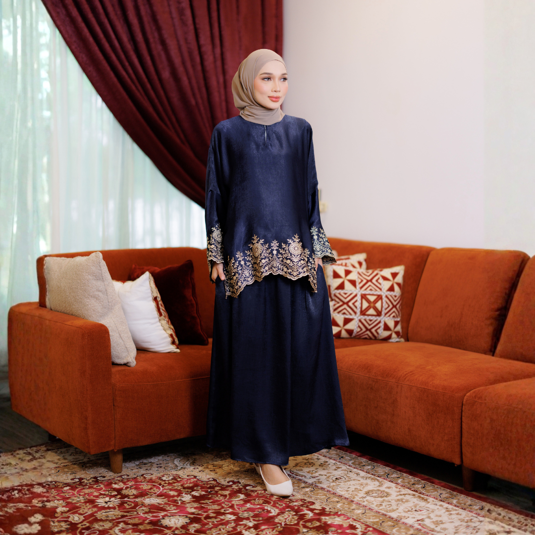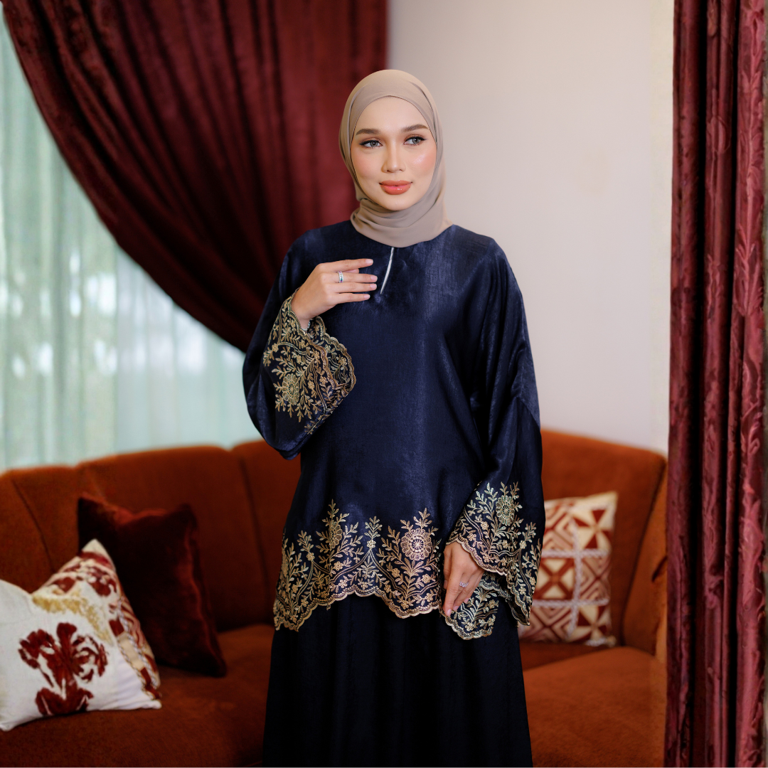Bahagian lengan dan bawah baju dihiasi sulaman eksklusif bercorak floral yang menaikkan seri pemakai. Cutting baju yang longgar memberi efek ramping, sopan, dan terletak cantik untuk semua bentuk badan.