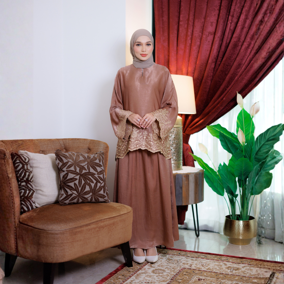 Datang bersama skirt A–Cut berpoket kiri dan kanan, menjadikan set ini bukan sahaja cantik tetapi sangat praktikal untuk kegunaan harian atau majlis.