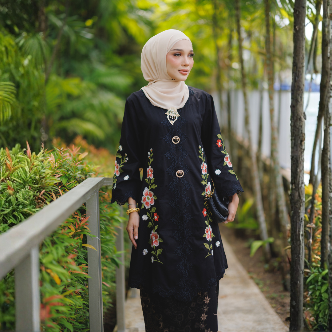Diperbuat daripada kain cotton berkualiti tinggi yang selesa dipakai seharian, diperkemaskan dengan sulaman tebal bermotif bunga yang tampak eksklusif dan anggun.