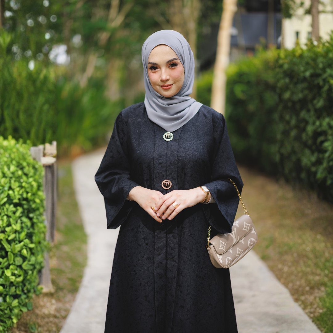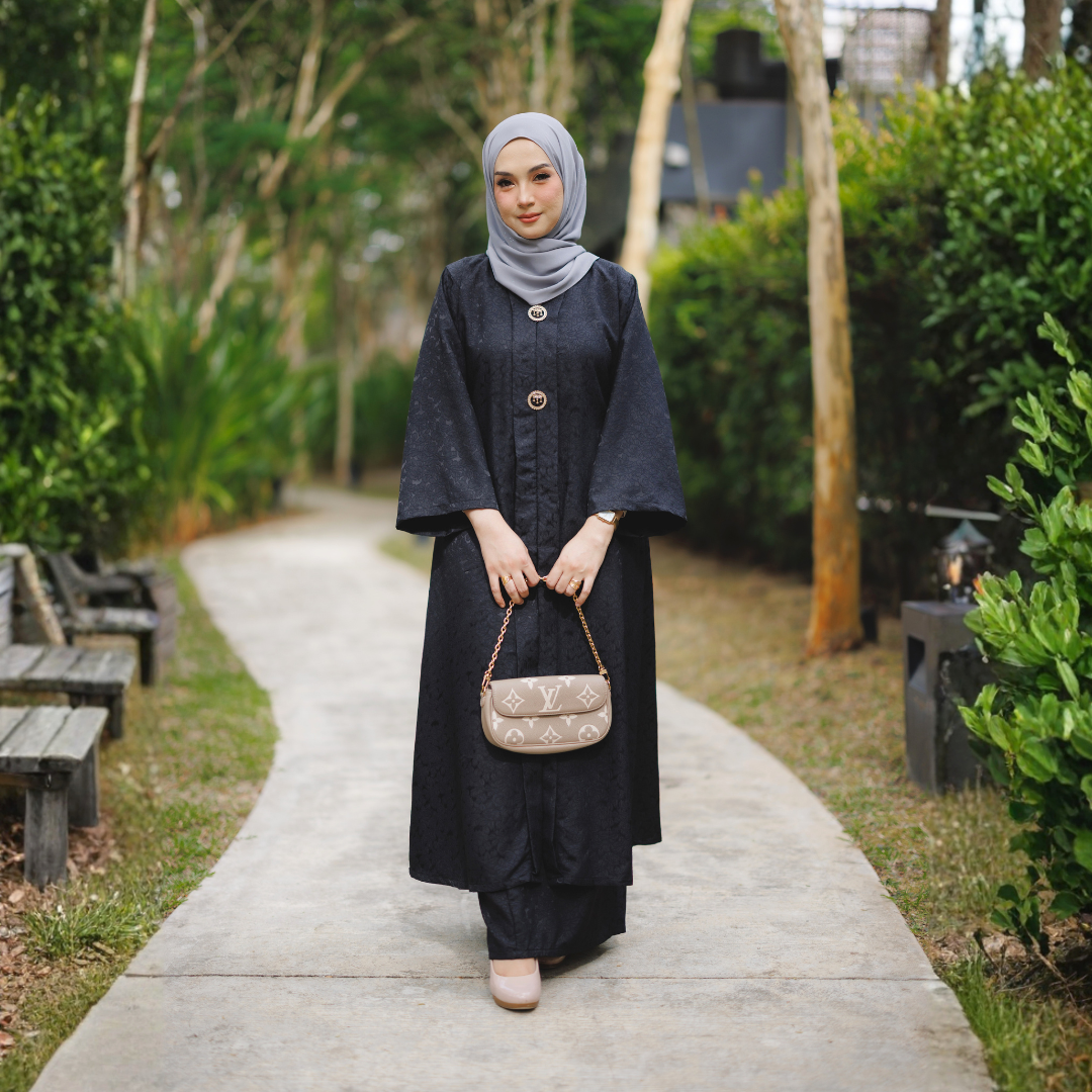 Potongan kebaya direka dalam siluet labuh klasik yang longgar dan tidak ketat, memberi keselesaan sepanjang hari sambil mengekalkan bentuk yang sopan dan elegan. Struktur fabrik Brocade yang kukuh namun lembut membantu kebaya jatuh dengan cantik, menghasilkan penampilan yang kemas dan berkelas dari setiap sudut.