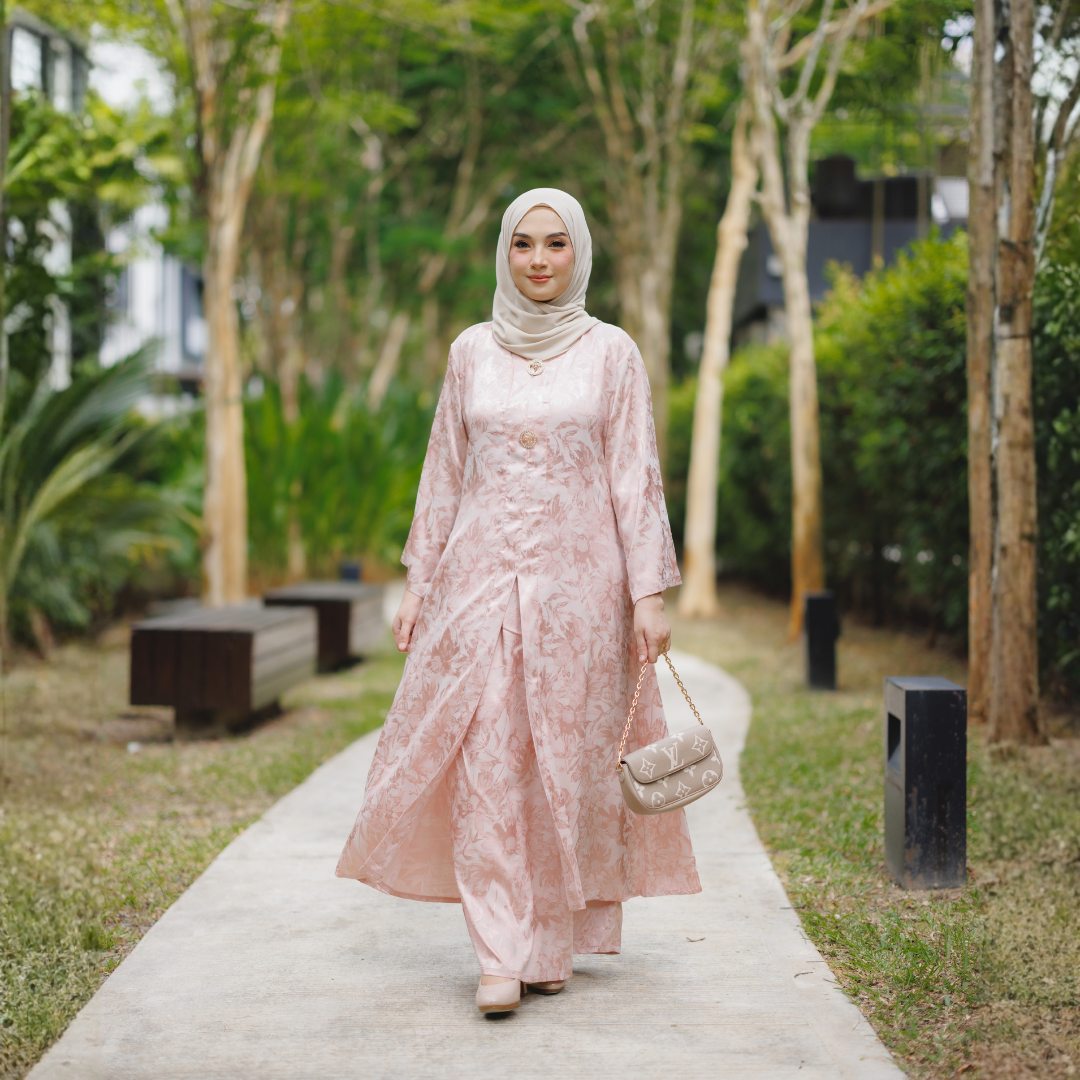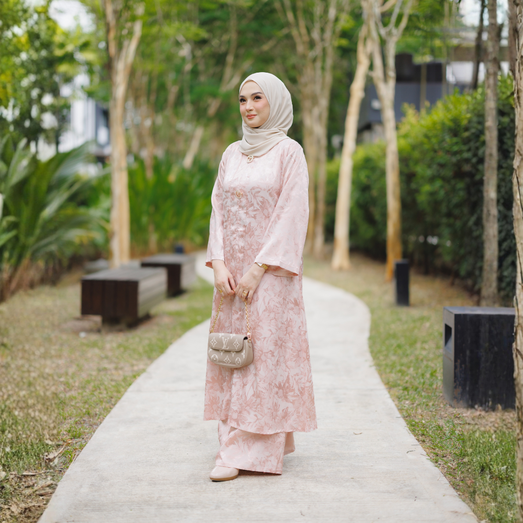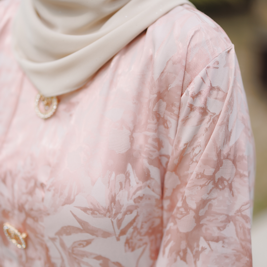 Potongan kebaya direka dalam siluet labuh klasik yang longgar dan tidak ketat, memberi keselesaan sepanjang hari sambil mengekalkan bentuk yang sopan dan elegan. Struktur fabrik jaquard yang kukuh namun lembut membantu kebaya jatuh dengan cantik, menghasilkan penampilan yang kemas dan berkelas dari setiap sudut.
