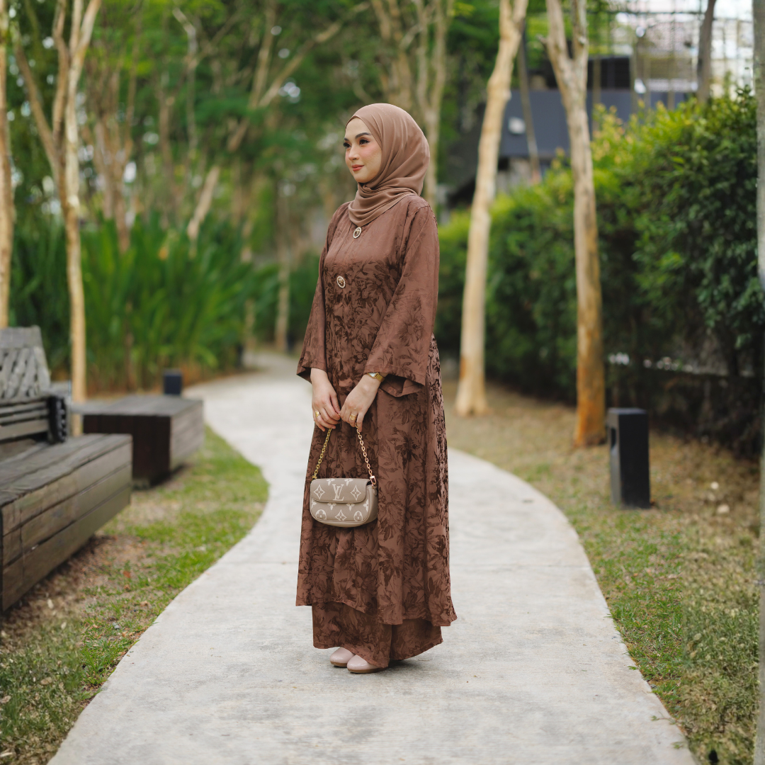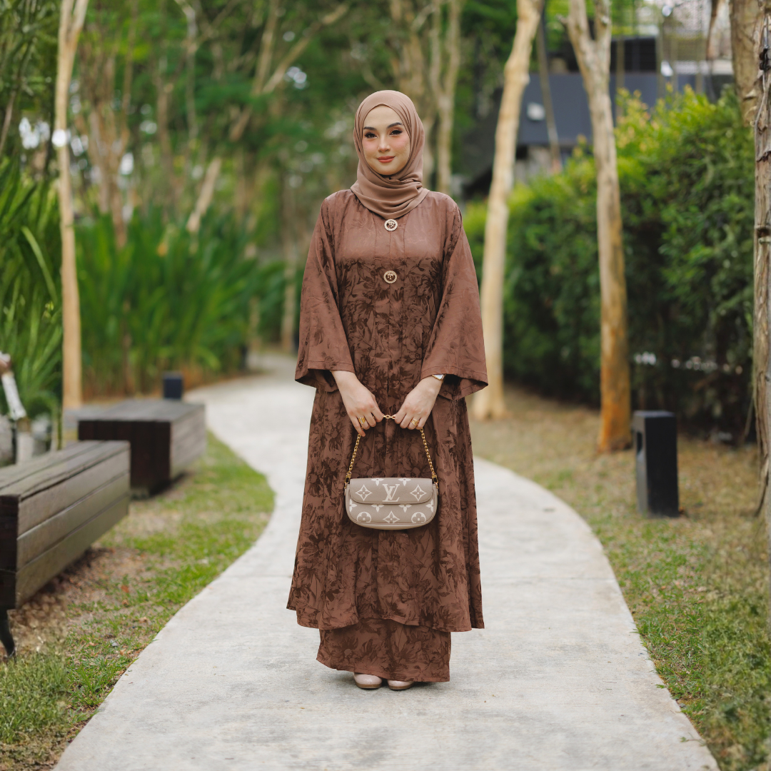Potongan kebaya direka dalam siluet labuh klasik yang longgar dan tidak ketat, memberi keselesaan sepanjang hari sambil mengekalkan bentuk yang sopan dan elegan. Struktur fabrik jaquard yang kukuh namun lembut membantu kebaya jatuh dengan cantik, menghasilkan penampilan yang kemas dan berkelas dari setiap sudut.