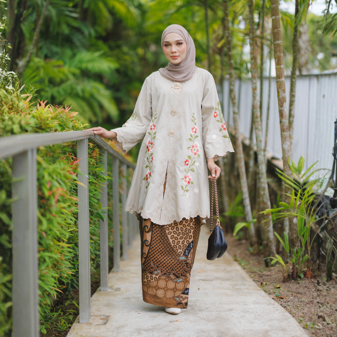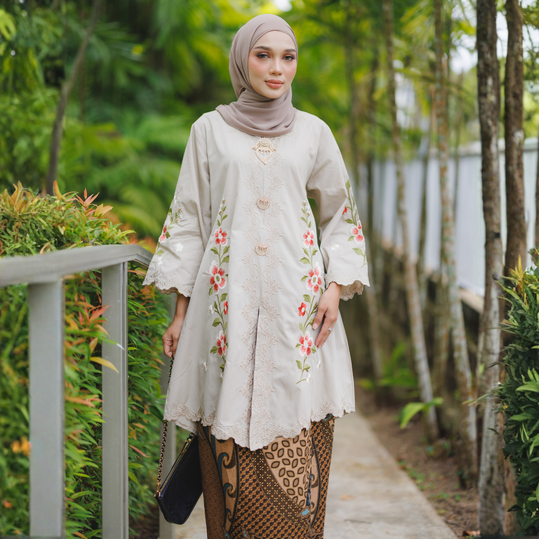 Diperbuat daripada kain cotton berkualiti tinggi yang selesa dipakai seharian, diperkemaskan dengan sulaman tebal bermotif bunga yang tampak eksklusif dan anggun.