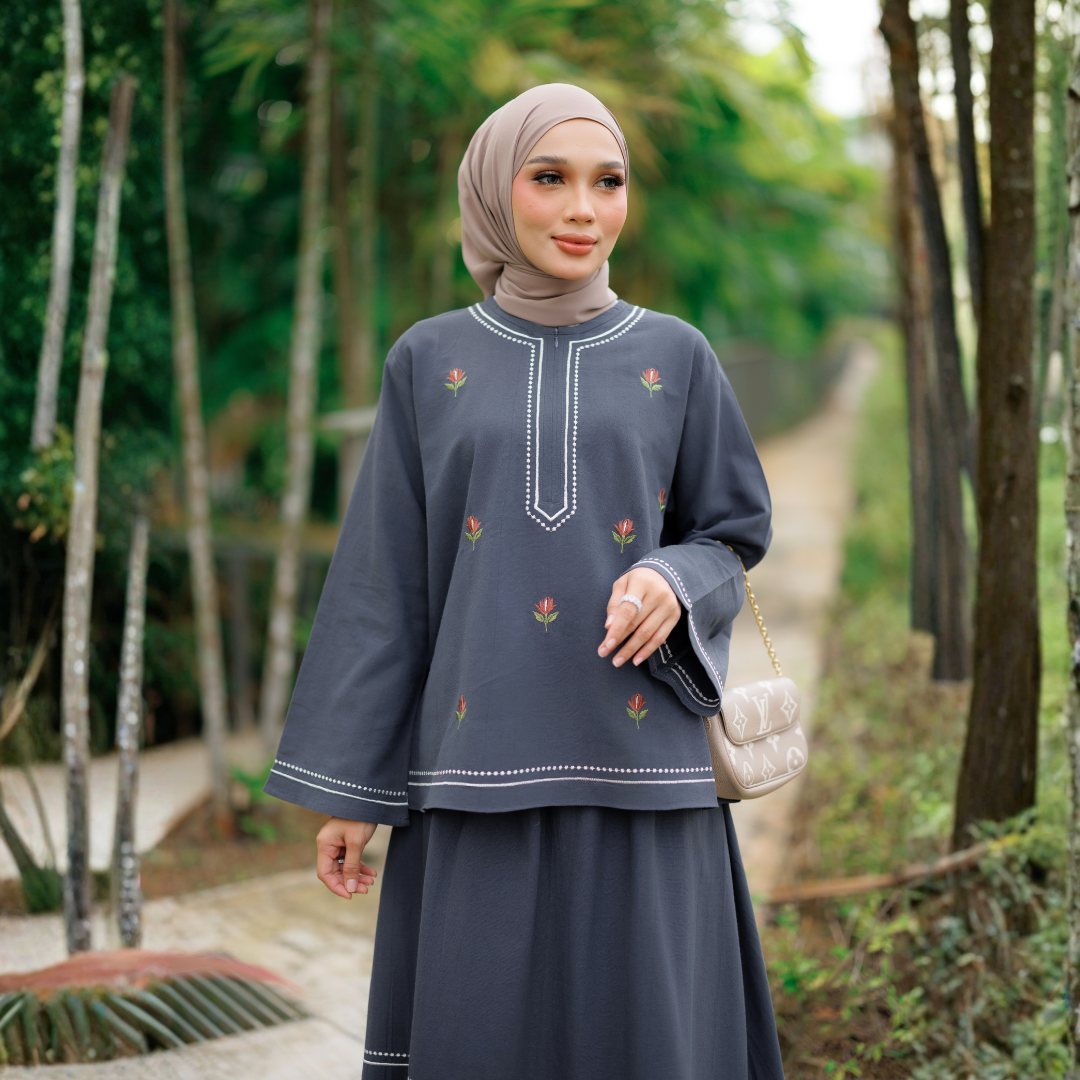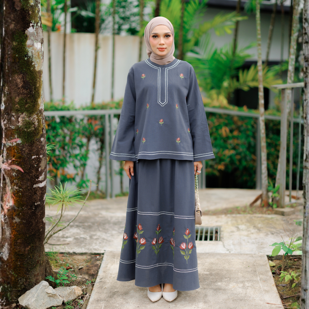 Diperbuat daripada fabrik Cotton Linen yang ringan, sejuk dan selesa dipakai sepanjang hari. Sulaman manis pada bahagian baju dan skirt menaikkan seri tanpa kelihatan berlebihan.