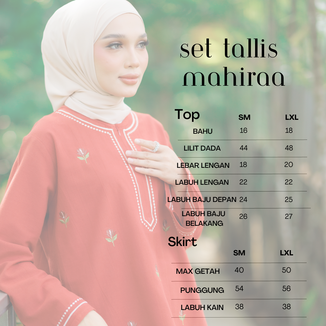 Set Tallis Mahira direka dengan sentuhan feminin dan kemasan sulaman yang halus, menjadikan ia pilihan sempurna untuk wanita yang menghargai keselesaan dan gaya.
