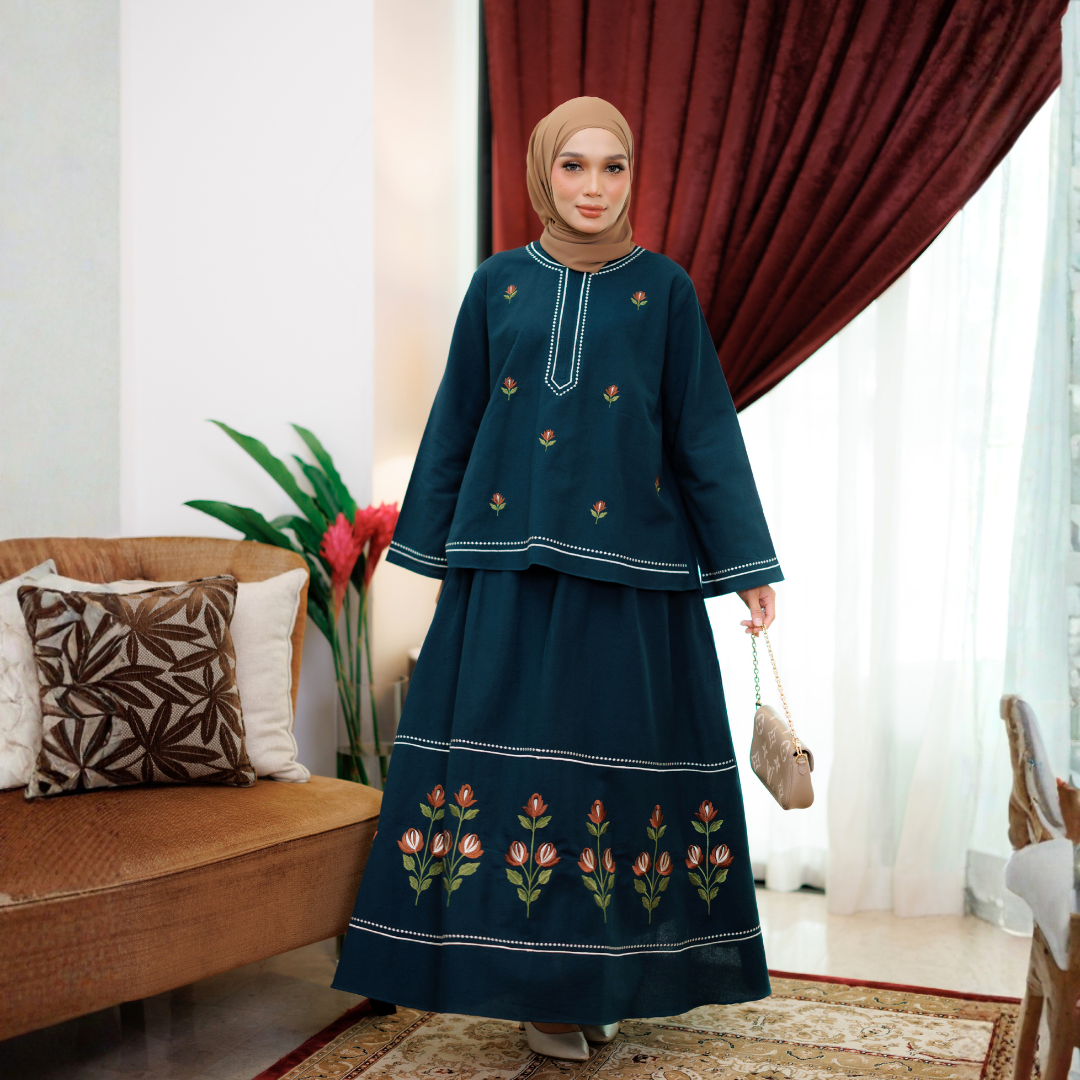 Diperbuat daripada fabrik Cotton Linen yang ringan, sejuk dan selesa dipakai sepanjang hari. Sulaman manis pada bahagian baju dan skirt menaikkan seri tanpa kelihatan berlebihan.