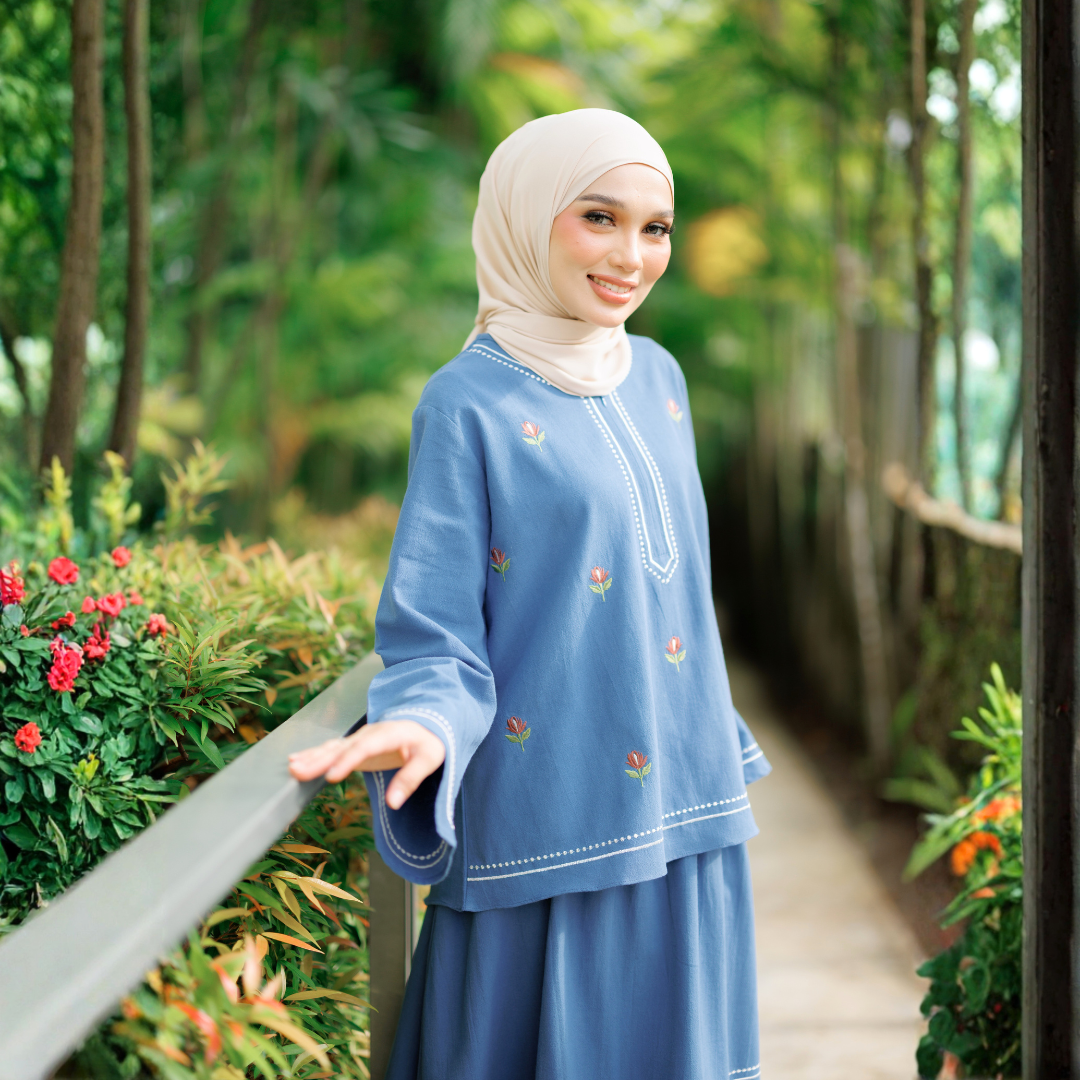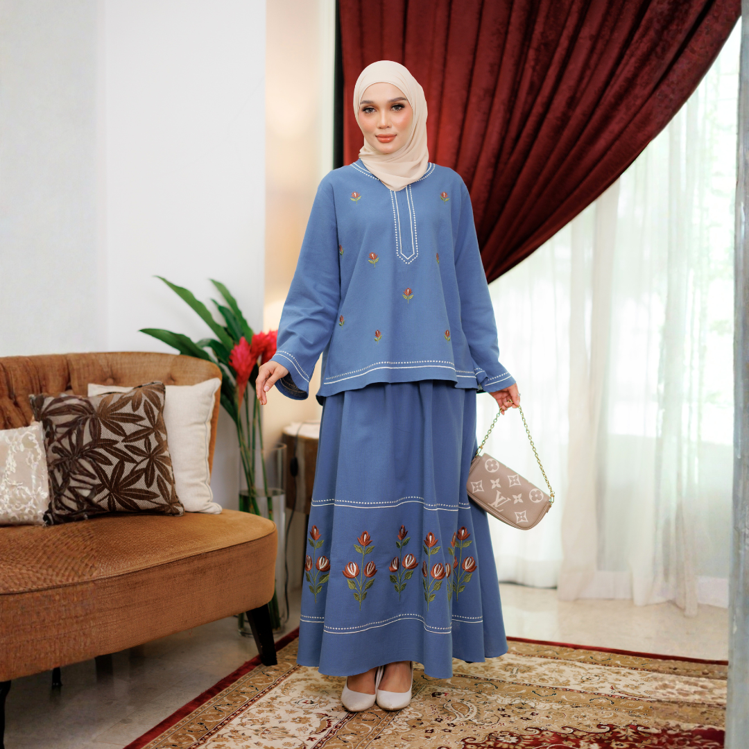Diperbuat daripada fabrik Cotton Linen yang ringan, sejuk dan selesa dipakai sepanjang hari. Sulaman manis pada bahagian baju dan skirt menaikkan seri tanpa kelihatan berlebihan.