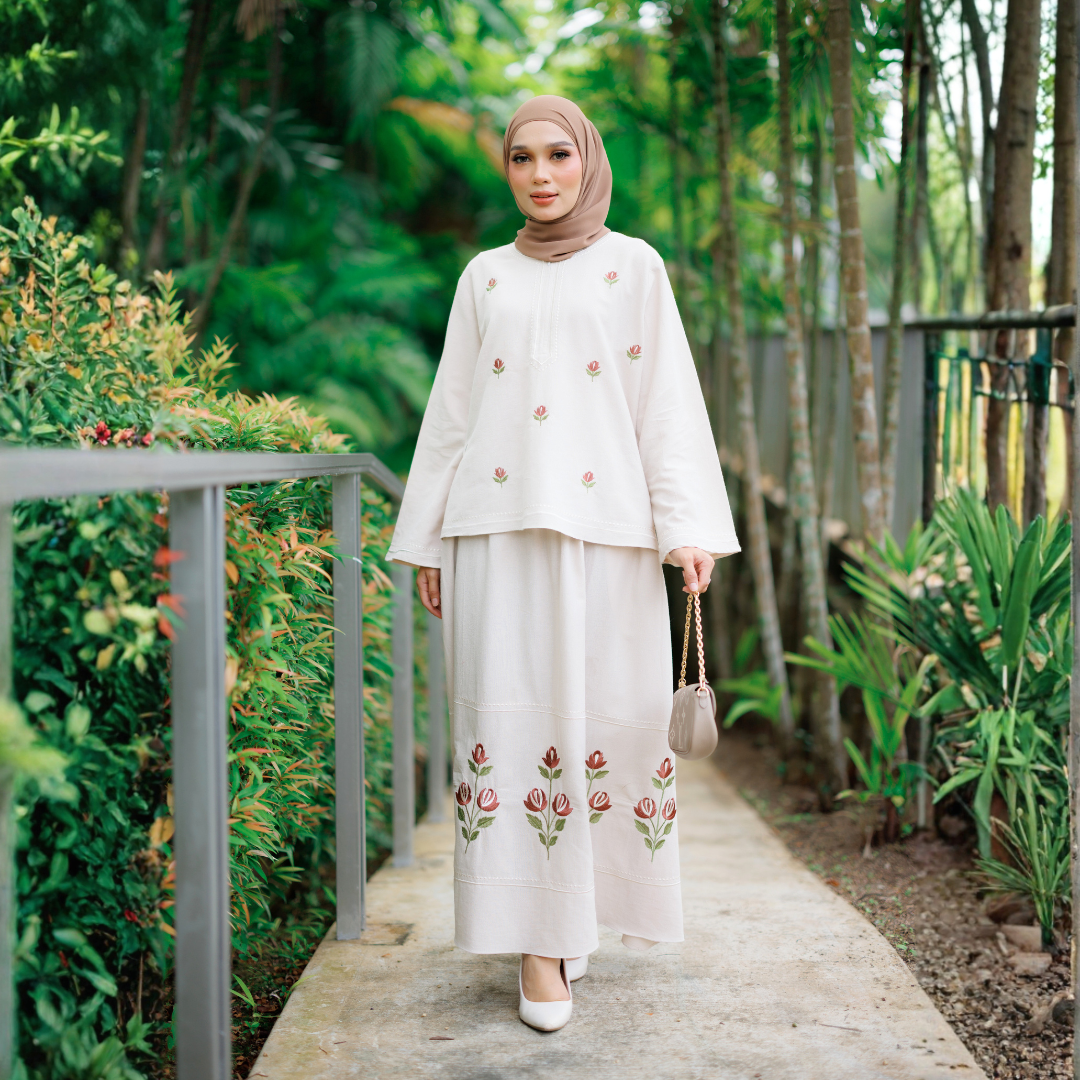 Diperbuat daripada fabrik Cotton Linen yang ringan, sejuk dan selesa dipakai sepanjang hari. Sulaman manis pada bahagian baju dan skirt menaikkan seri tanpa kelihatan berlebihan.