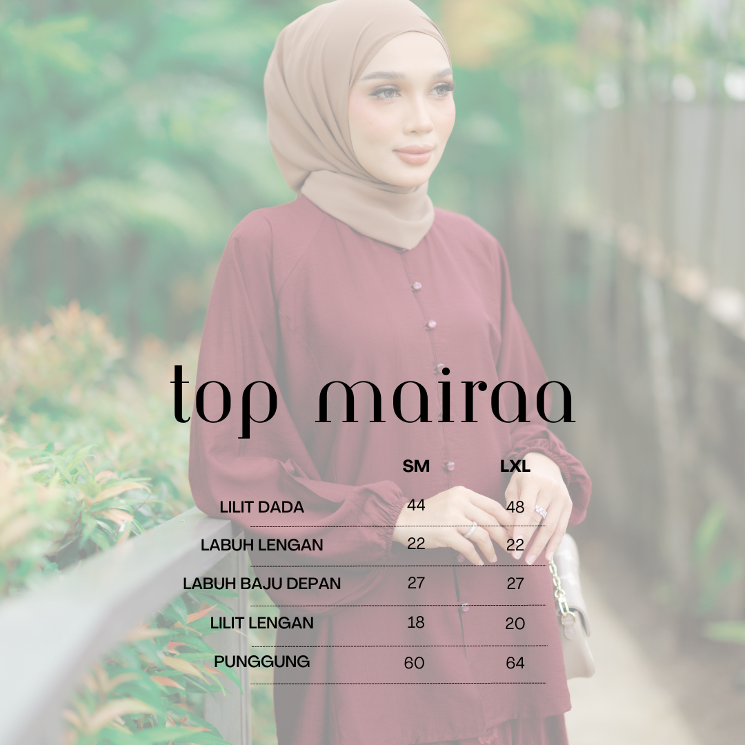 Rekaan lengan baloon memberi efek anggun tanpa berlebihan, manakala tali ikat di bahagian belakang membolehkan pelarasan mengikut kesesuaian badan untuk keselesaan maksimum. Butang penuh di bahagian hadapan menjadikan Top Mairaa praktikal, kemas dan mudah digayakan sama ada untuk gaya santai, kerja atau majlis ringkas.