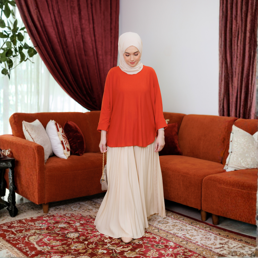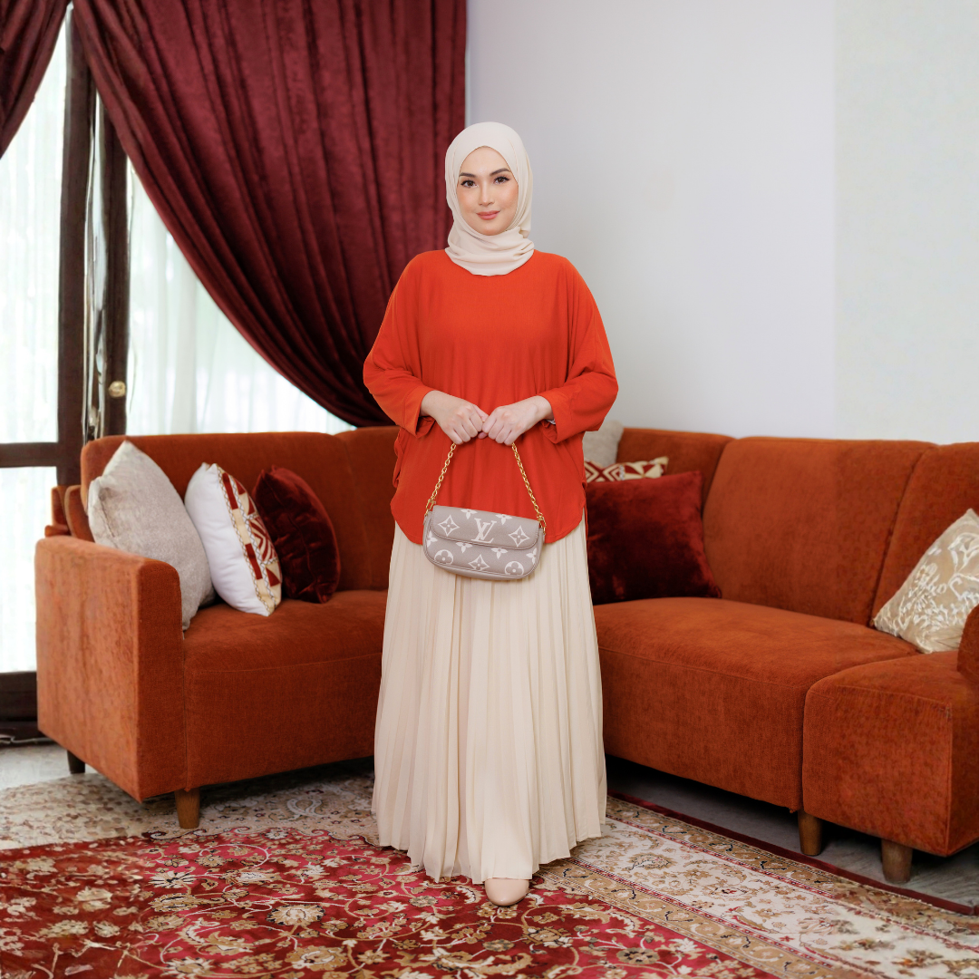 Material cotton t-shirt memberi rasa lembut, sejuk, dan breathable — sesuai untuk cuaca panas mahupun seharian bekerja. Potongan batwing longgar menjadikan ia flattering untuk semua bentuk tubuh, memberi efek flowy dan sopan tanpa melekap di badan.