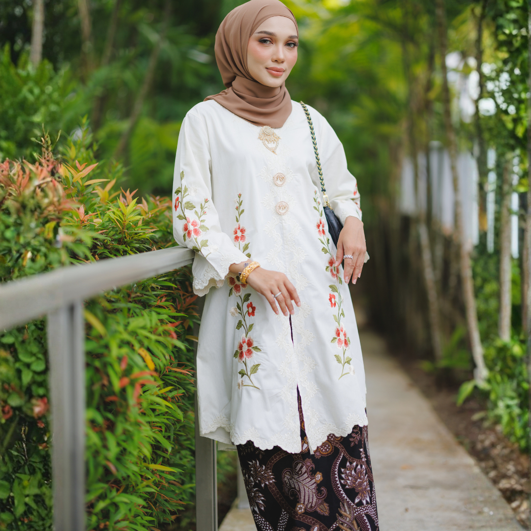 Diperbuat daripada kain cotton berkualiti tinggi yang selesa dipakai seharian, diperkemaskan dengan sulaman tebal bermotif bunga yang tampak eksklusif dan anggun.