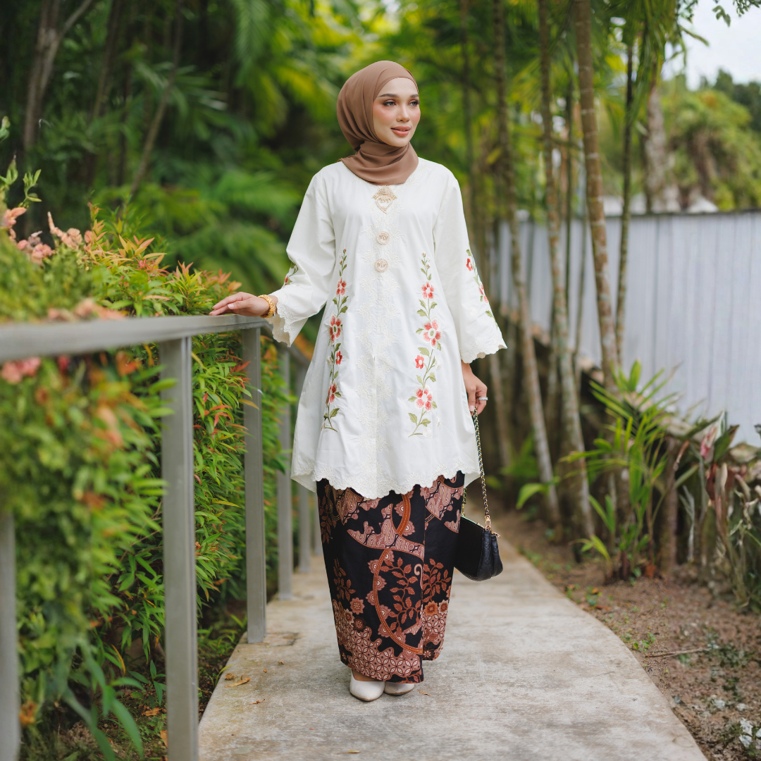 Diperbuat daripada kain cotton berkualiti tinggi yang selesa dipakai seharian, diperkemaskan dengan sulaman tebal bermotif bunga yang tampak eksklusif dan anggun.