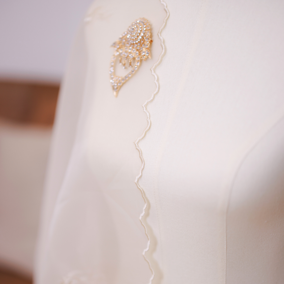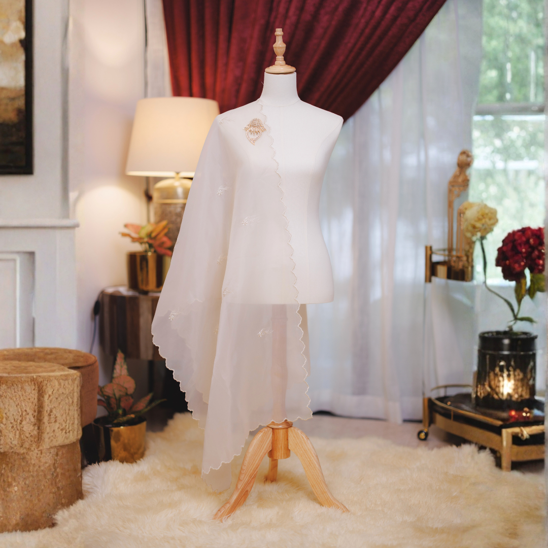 Dilengkapi dengan sulam tepi yang manis dan halus, kemasan beralun ini menambahkan elemen feminin tanpa nampak berlebihan. Perincian sulaman yang kemas memberi sentuhan premium dan menjadikan selendang ini sesuai digayakan untuk majlis formal, pernikahan, atau sebagai pelengkap busana raya.